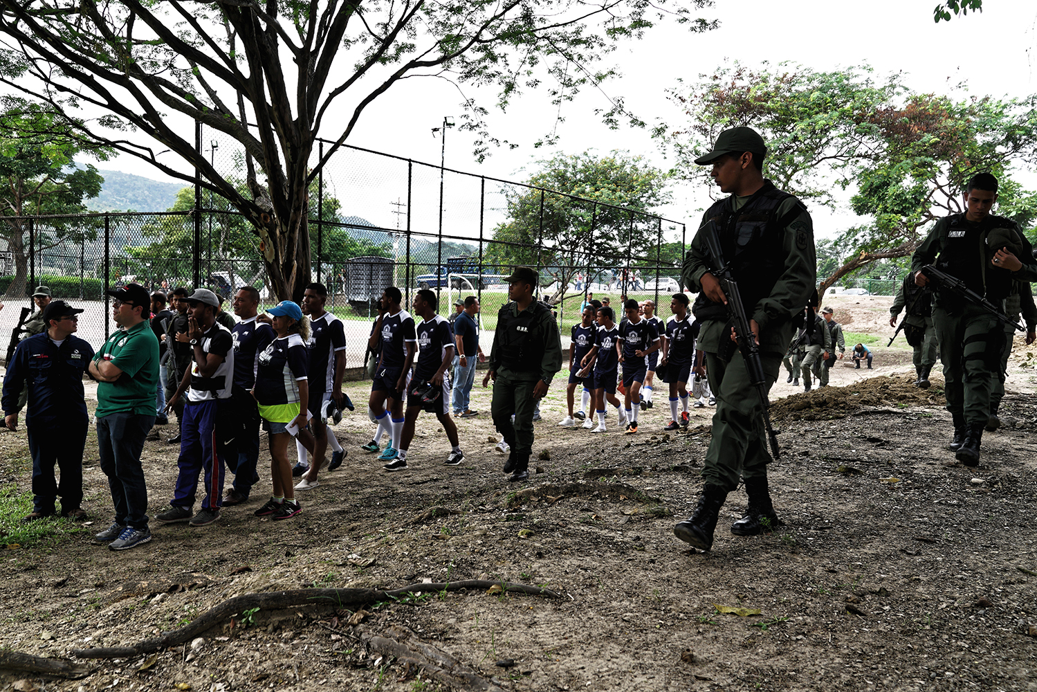 « Et là il n’y a pas faute? » Postés tout autour du terrain, kalachnikov en bandoulière, les soldats de la Garde Nationale Bolivarienne - l’armée vénézuélienne - commentent, perplexes, les règles du rugby. Le classement mondial du Venézuela est là pour l’attester : 62ème mondial juste devant le Luxembourg, le rugby reste un sport marginal dans ce pays tropical même s’il connaît un intérêt grandissant depuis quelques années en particulier du coté du rugby à 7et de la ligue féminine. Mais si les militaires ont été déployés en nombre ce jour là sur la pelouse de la Hacienda de Santa Teresa, l’une des rhumerie les plus célèbres du pays, ce n'est pas pour se familiariser avec les règles de ce sport. Sur le terrain évoluent des “privés de liberté” selon la terminologie de la révolution bolivarienne, condamnés pour vols, meurtres, viols ou trafic de drogue et incarcérés dans l’une des prisons du pays.